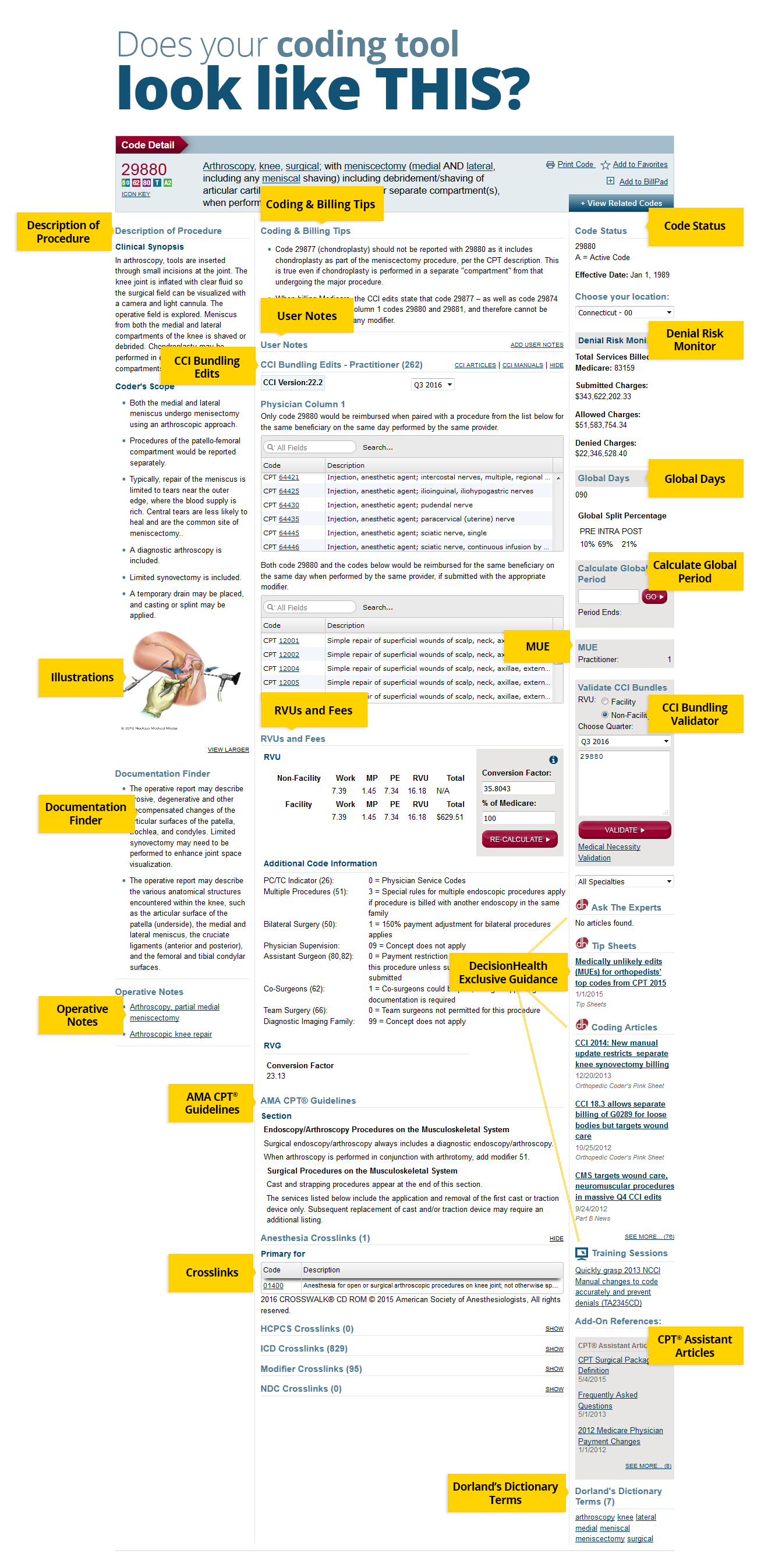 Get to the right answer faster with at-a-glance decision making information displayed in a single code detail page. Unlike competitors where information is buried under constant clicking, SelectCoder saves time and effort delivering information in fewer clicks and less pages. We dare you to compare! Click to view a screen shot. - LCD and NCD Policies: